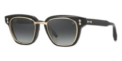This square Akoni sunglass comes in a shiny black and brushed 12k gold frame with dark grey to light grey with light mirror lenses.