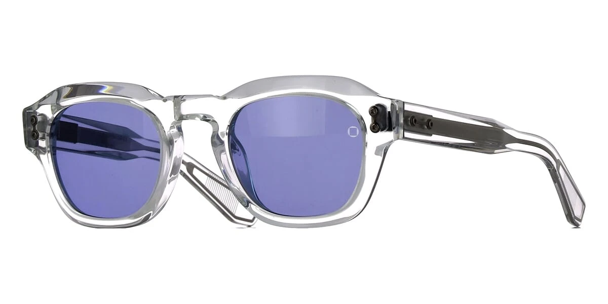 This square Akoni sunglass comes in a crystal clear frame with dusty blue lenses.