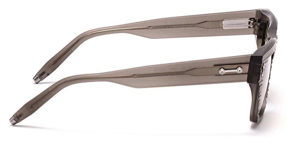 This square Akoni sunglass comes in a light green frame with grey lenses.