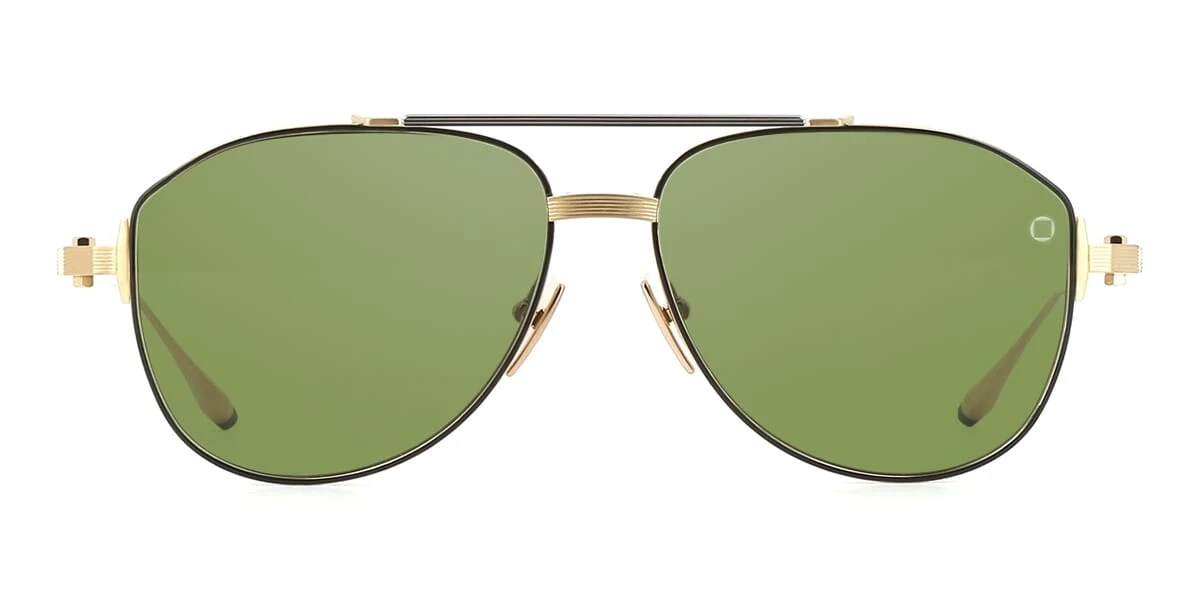 This aviator Akoni sunglass comes in a brushed gold and black palladium frame with green with light mirror lenses.