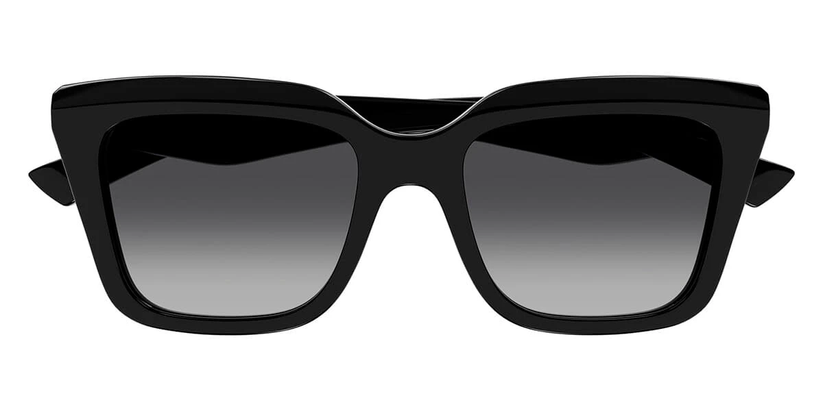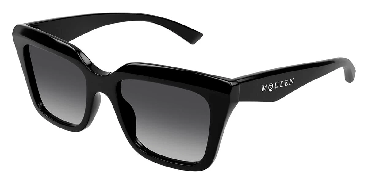 This square Alexander McQueen sunglass comes in a shiny black frame with grey gradient lenses.