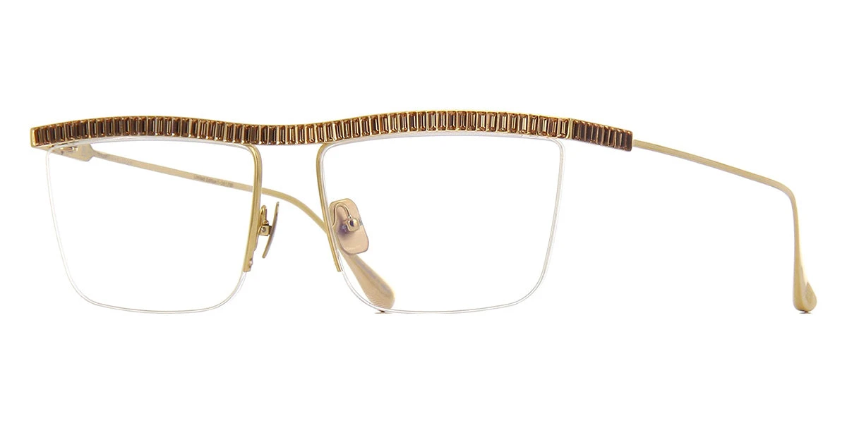 The Sheika rectangular optical glasses embody the spirit of the collection, beautifully juxtaposing classic elegance with high glamour detailing. The frame is crafted from lightweight and durable 24 carat gold-plated Japanese titanium, and fitted with clear anti-reflex supra lenses. The front and temples of the frame are crowned by a row of amber coloured baguette cut crystals; hand finished in a channel set mounting to give timelessly elegant sparkle.