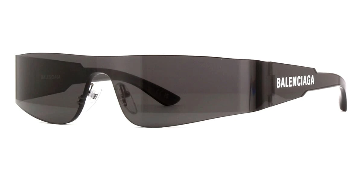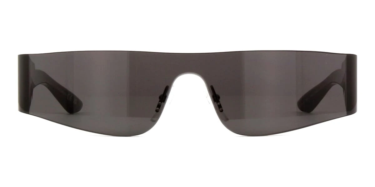 This shield Balenciaga sunglass comes in a grey crystal frame with grey lenses.