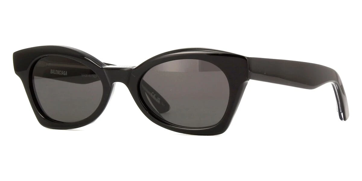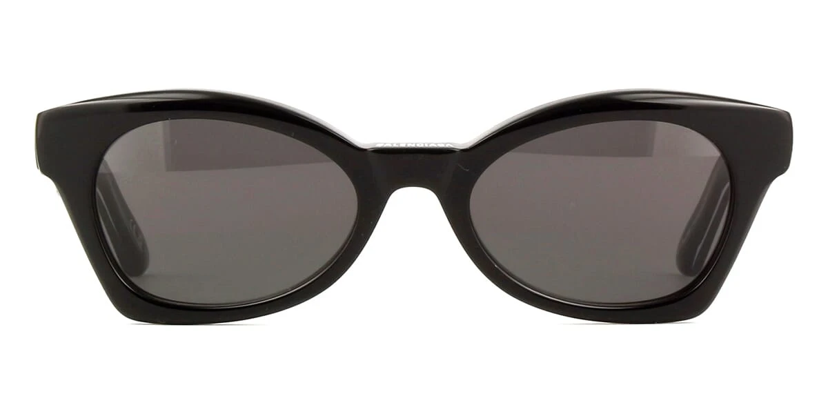 This cat eye Balenciaga sunglass comes in a shiny black frame with grey lenses.