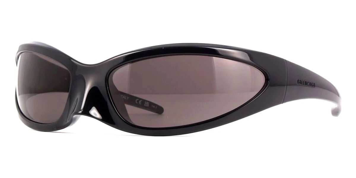 This wraparound Balenciaga sunglass comes in a shiny black frame with grey lenses.