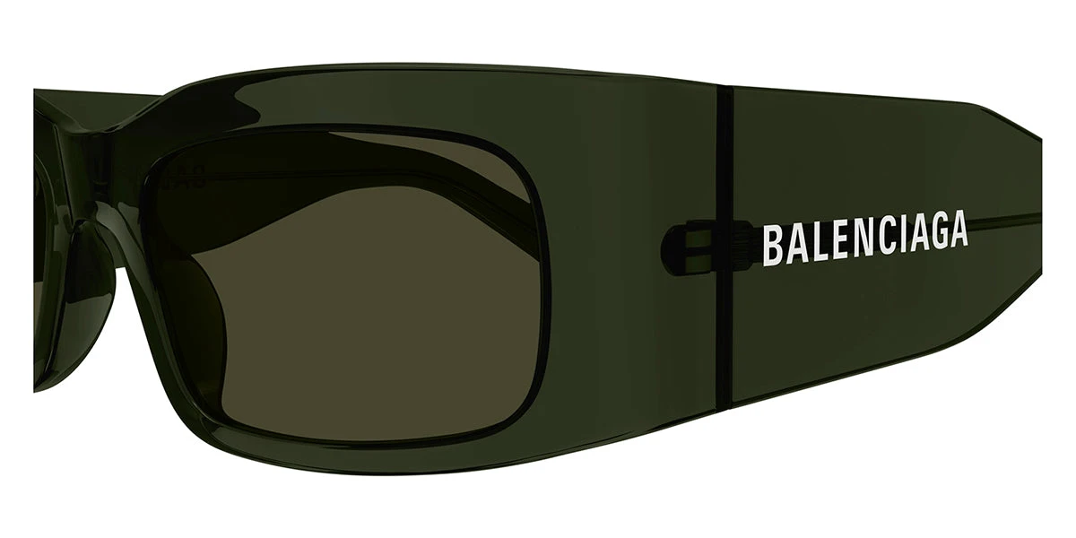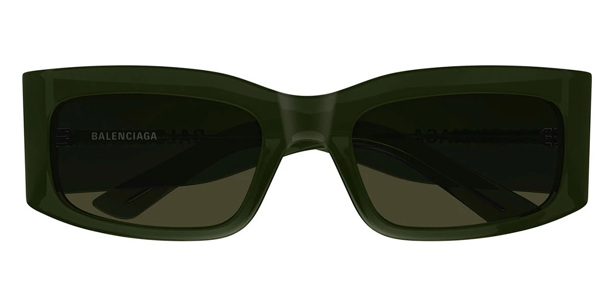 This square Balenciaga sunglass comes in a dark green frame with green with light mirror lenses.
