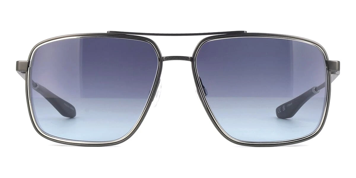 This square Barton Perreira sunglass comes in a gunmetal grey and 24k white gold plated including special edition golden gun bullet keyring frame with dark blue gradient lenses.