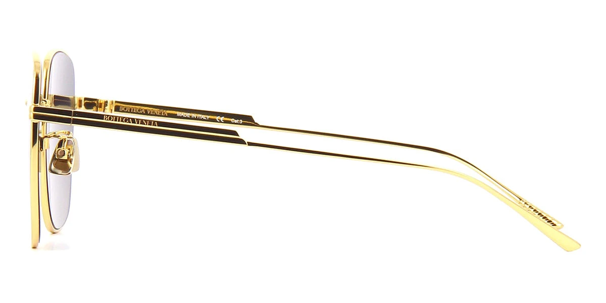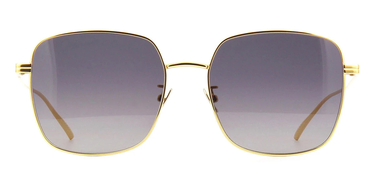 This square Bottega Veneta sunglass comes in a gold frame with grey gradient lenses.