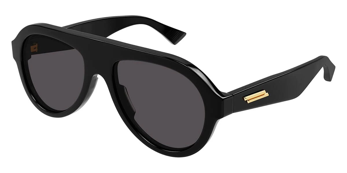 This round Bottega Veneta sunglass comes in a black frame with grey lenses.