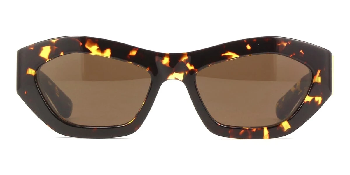 This cat eye Bottega Veneta sunglass comes in a shiny spotted dark havana frame with brown lenses.