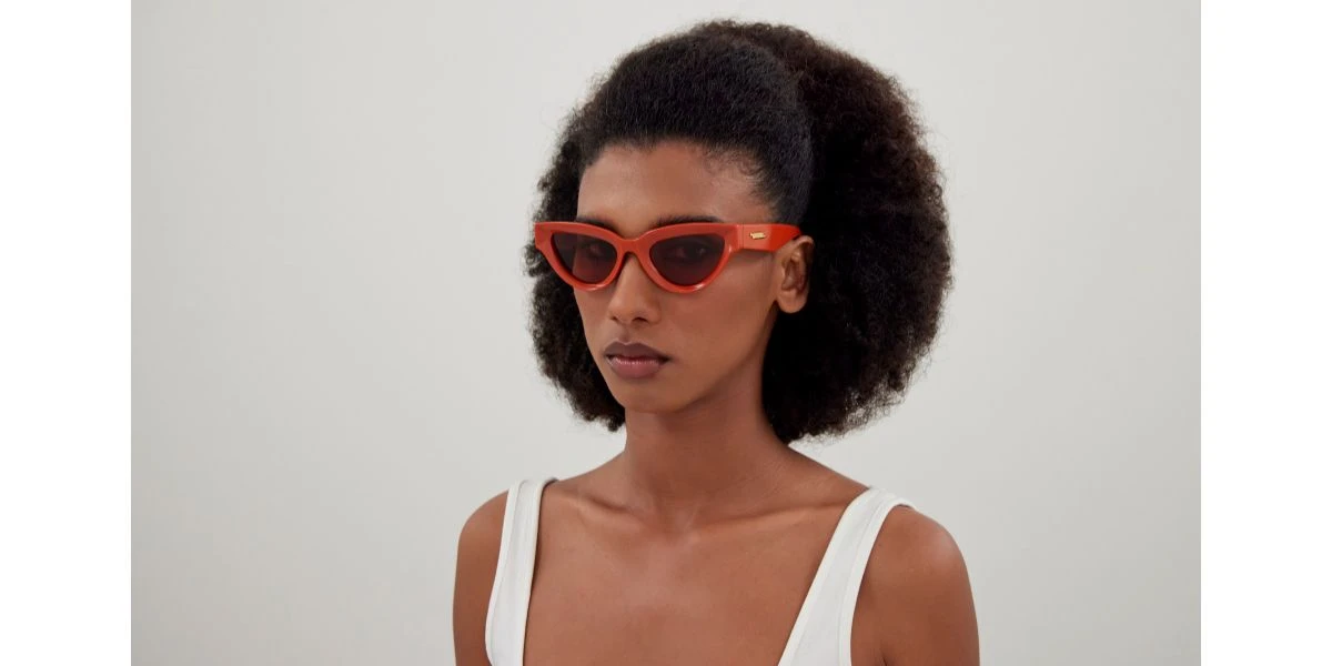 This cat eye Bottega Veneta sunglass comes in a orange red with gold frame with brown lenses.