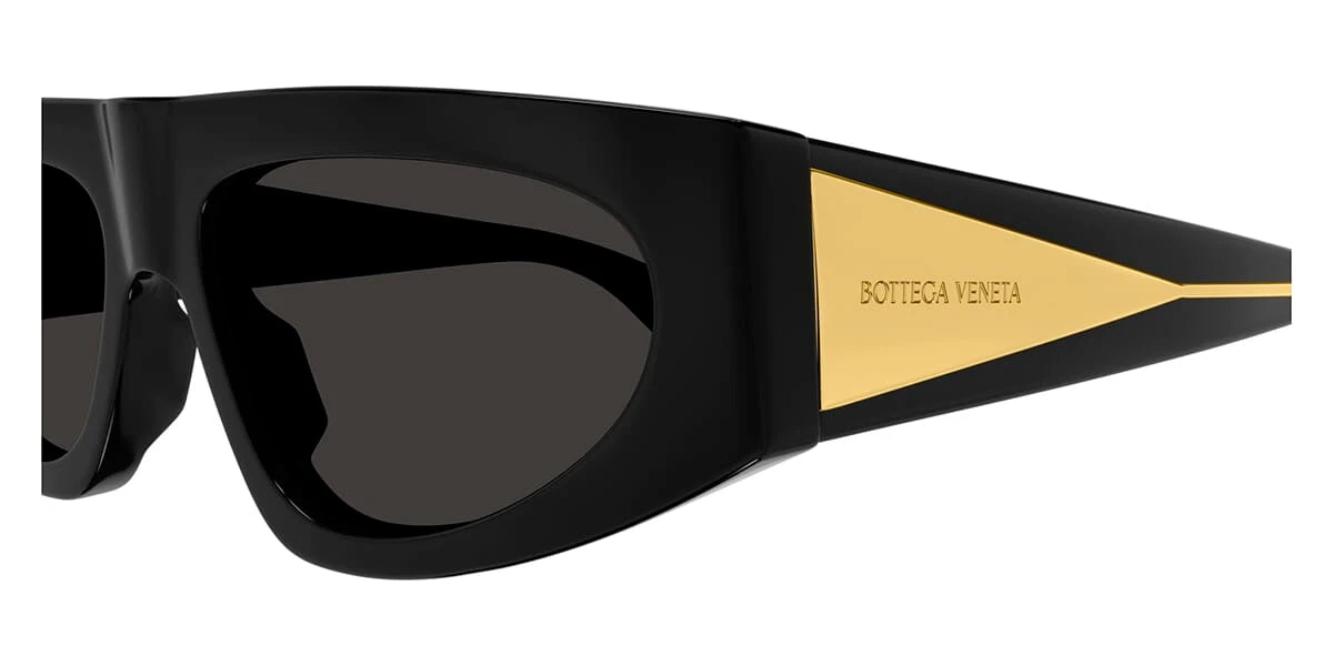 This square Bottega Veneta sunglass comes in a shiny black crystal with gold frame with grey lenses.