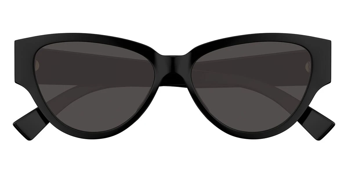 This cat eye Bottega Veneta sunglass comes in a shiny black frame with grey with light mirror lenses.