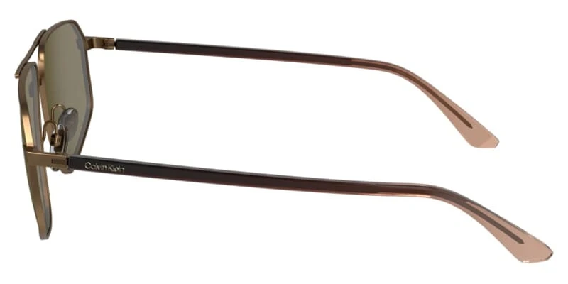 This square Calvin Klein sunglass comes in a matte amber gold frame with brown lenses.