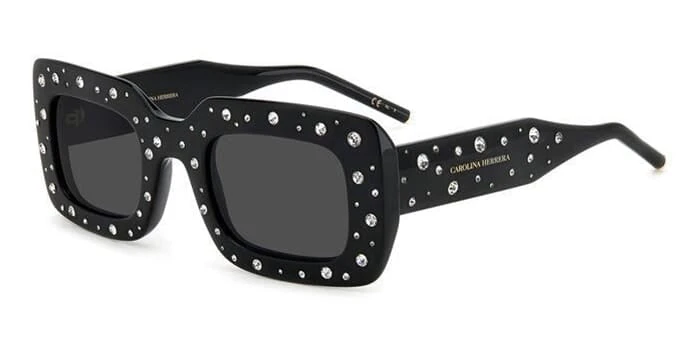 This square Carolina Herrera sunglass comes in a black with crystal frame with grey solid tint cat 3 lenses.