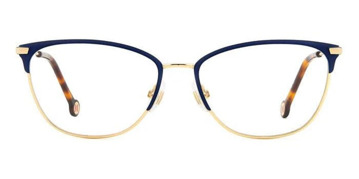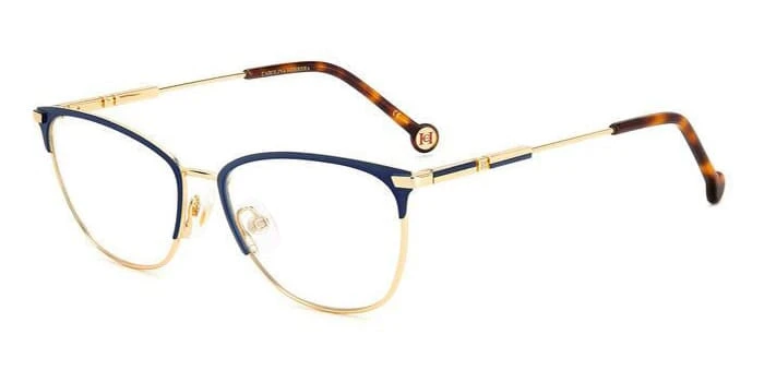 This square Carolina Herrera optical comes in a gold blue with havana frame.