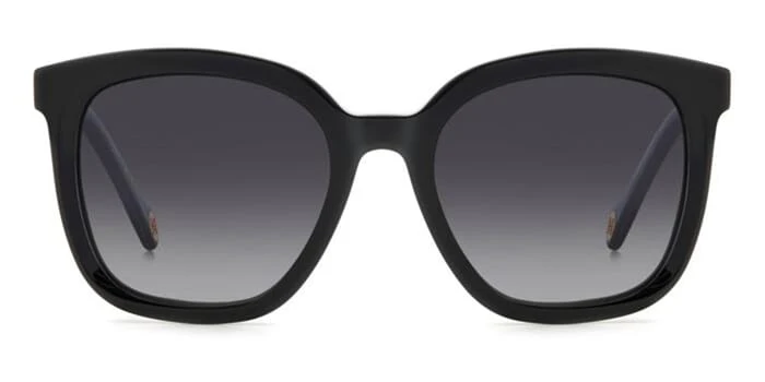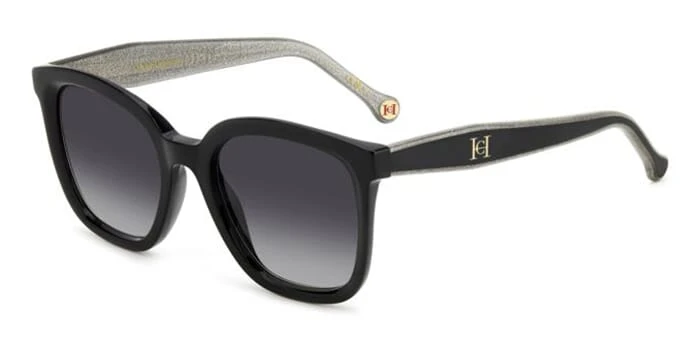 This square Carolina Herrera sunglass comes in a black with silver glitter temples frame with grey gradient lenses.