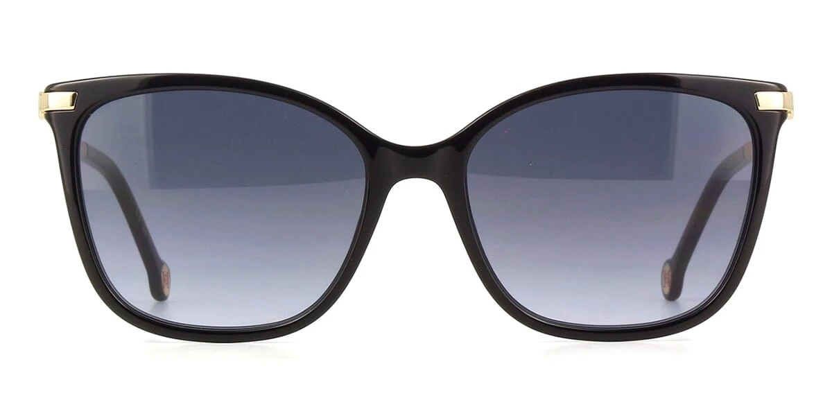 This cat eye Carolina Herrera sunglass comes in a shiny black frame with grey gradient lenses.