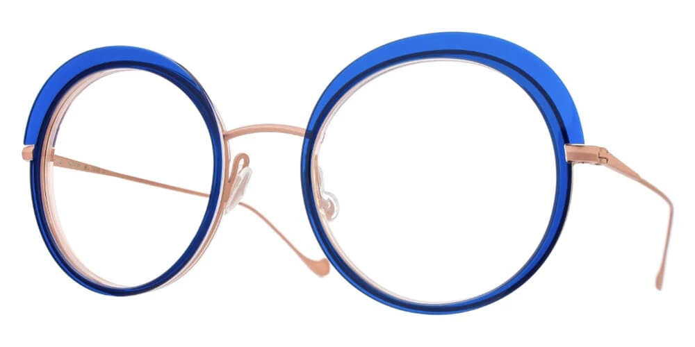 This round Caroline Abram optical comes in a electric blue and rose gold frame.