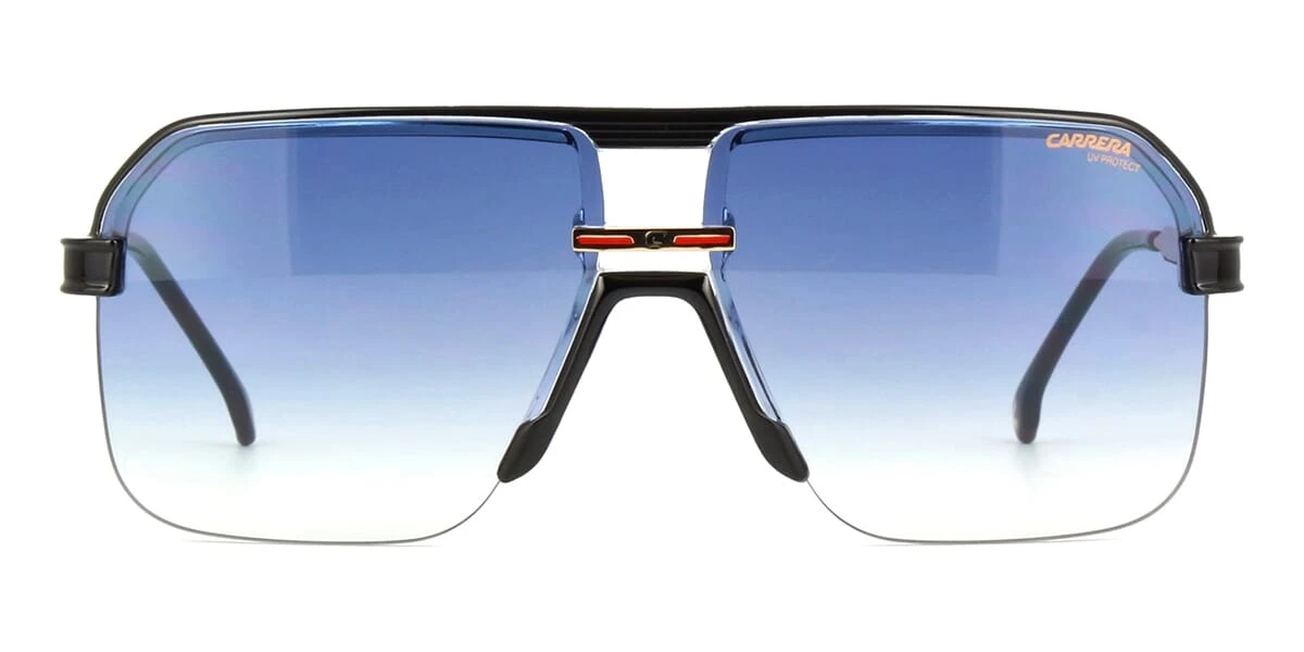 This square Carrera sunglass comes in a shiny black frame with blue gradient lenses.