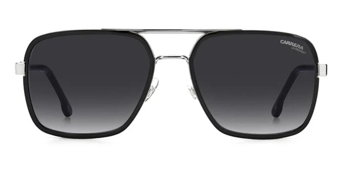 This square Carrera sunglass comes in a black and ruthenium frame with dark grey gradient lenses.
