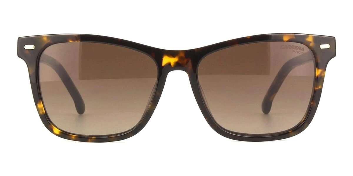 This square Carrera sunglass comes in a shiny dark havana frame with brown gradient lenses.