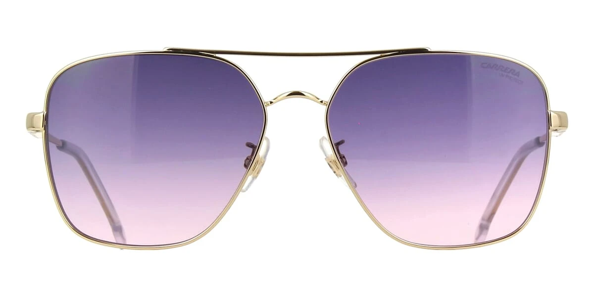 This square Carrera sunglass comes in a shiny gold frame with grey to pink gradient lenses.