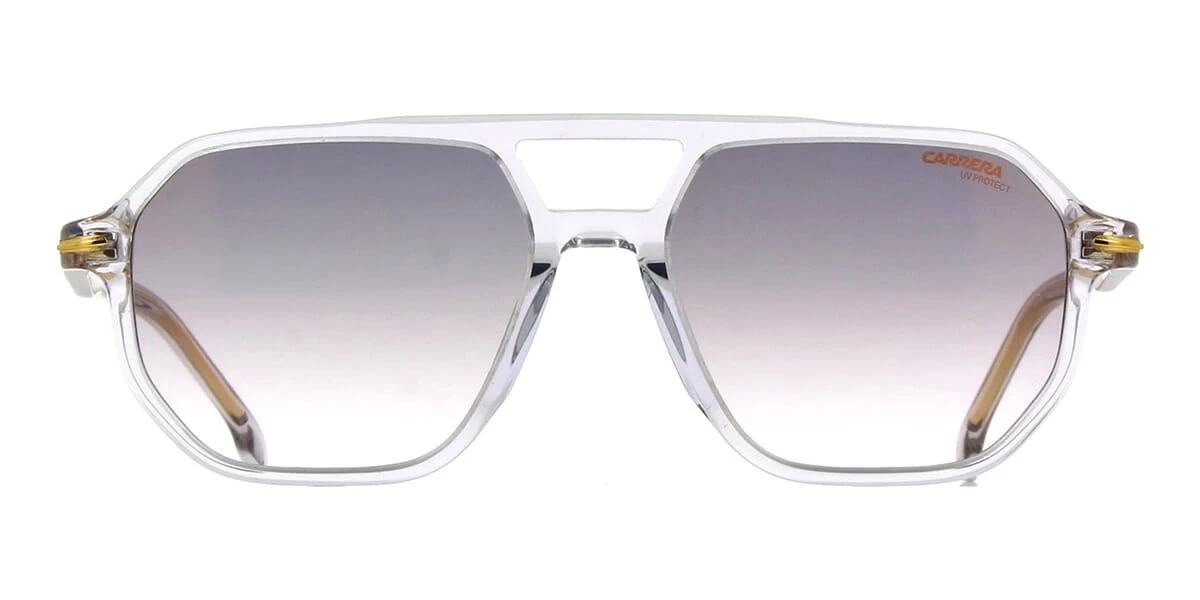 This square Carrera sunglass comes in a grey crystal frame with brown gradient with gold mirror lenses.