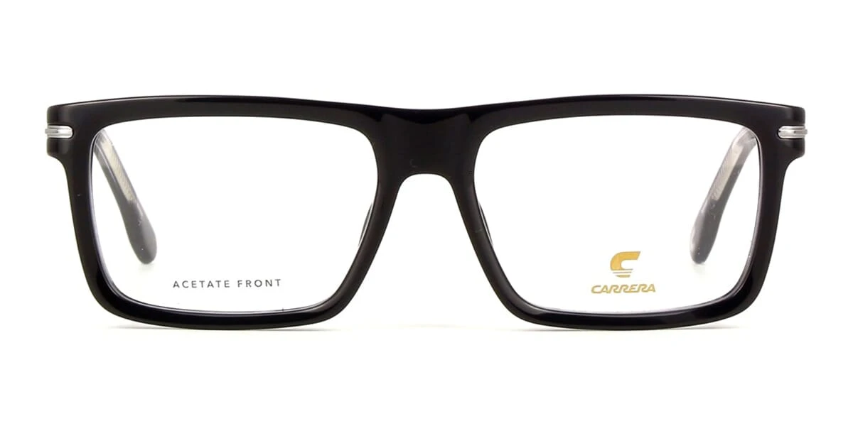 This square Carrera optical comes in a shiny black and ruthenium frame.