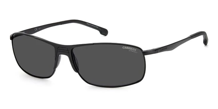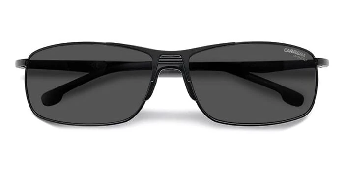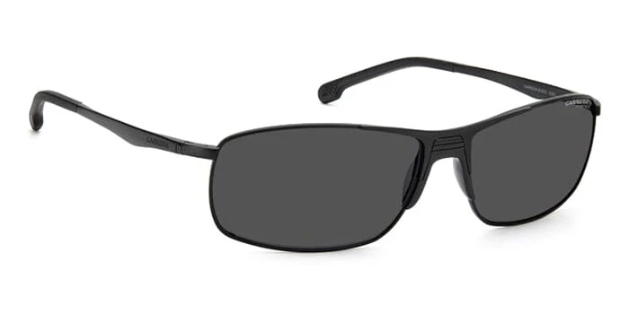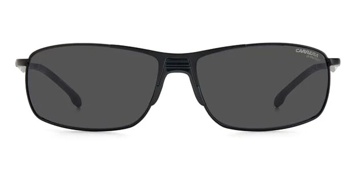 This rectangular Carrera sunglass comes in a matte black frame with grey lenses.