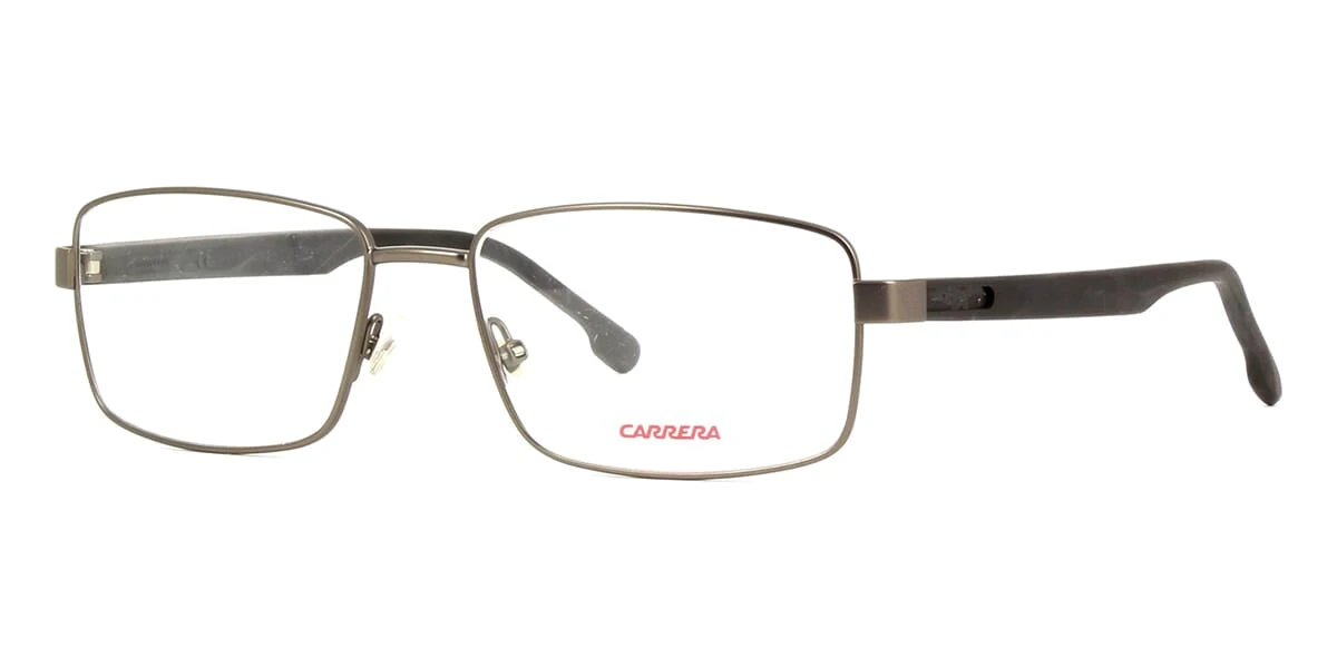 This square Carrera optical comes in a matte dark ruthenium frame.