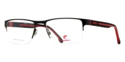 This square Carrera optical comes in a matte black and red frame.