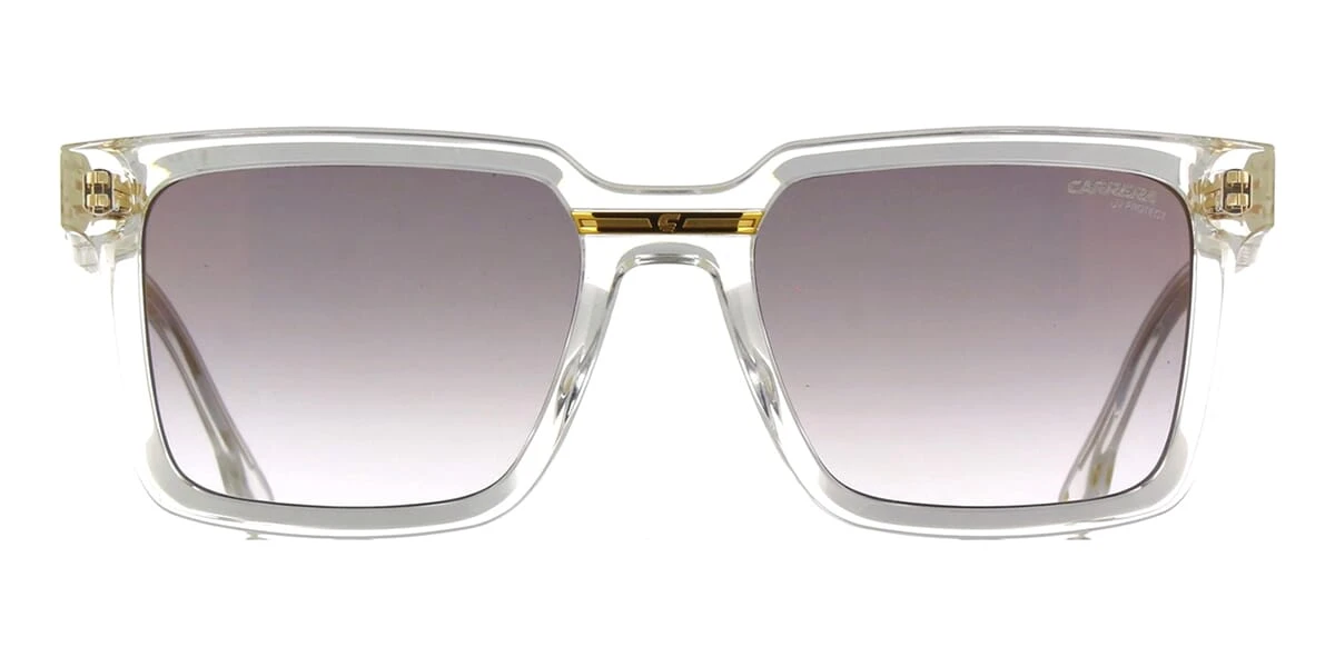 This square Carrera sunglass comes in a grey crystal and gold frame with grey gradient with bronze mirror lenses.