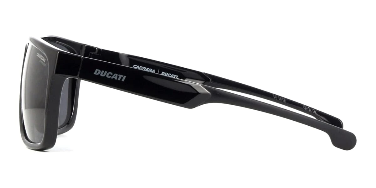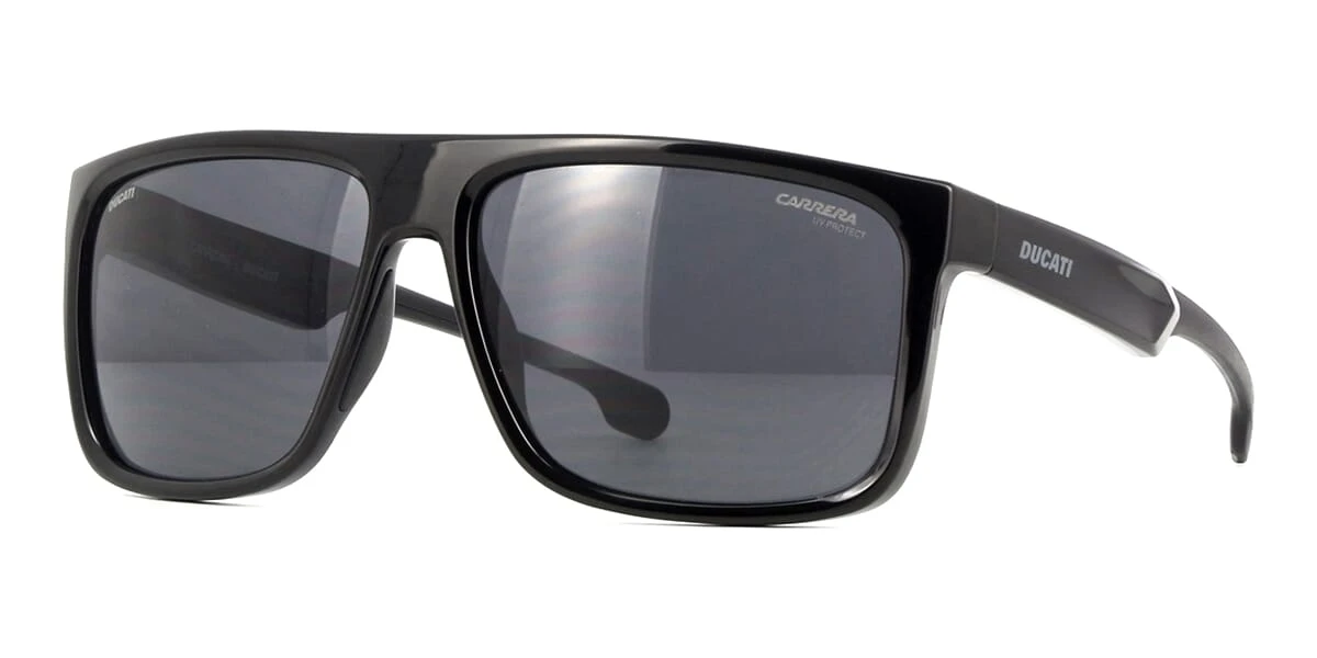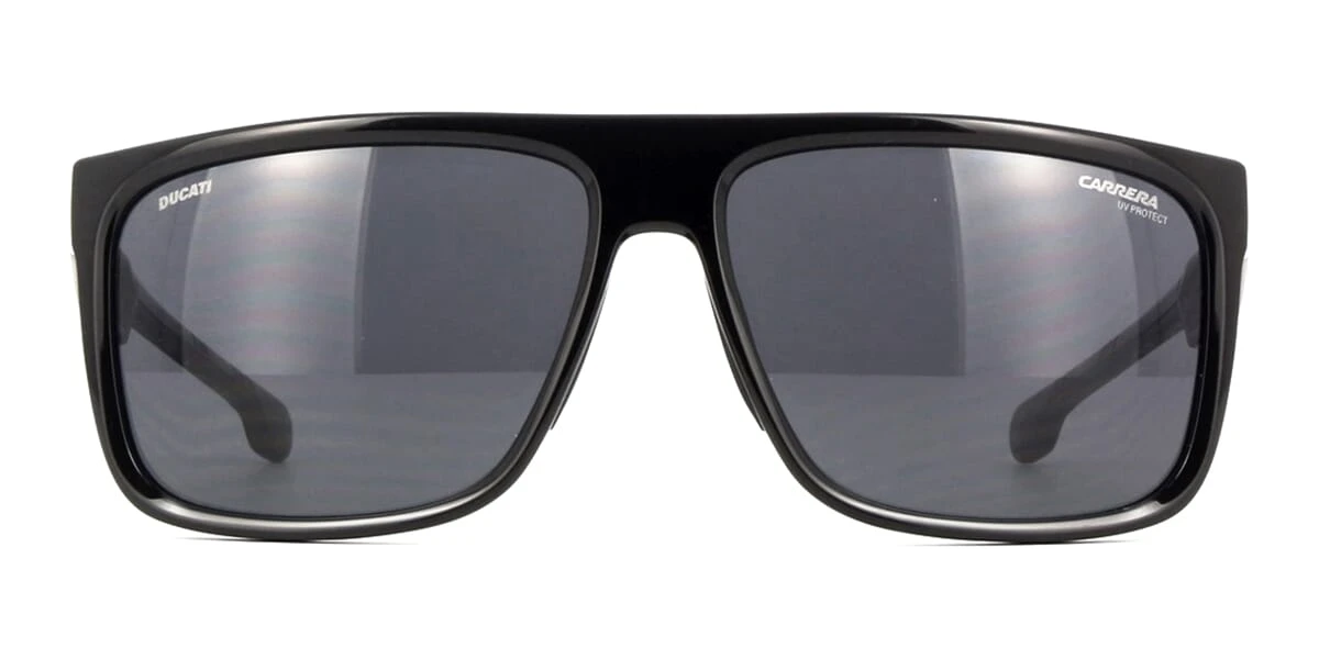 This square Carrera sunglass comes in a shiny black frame with grey with light mirror lenses.