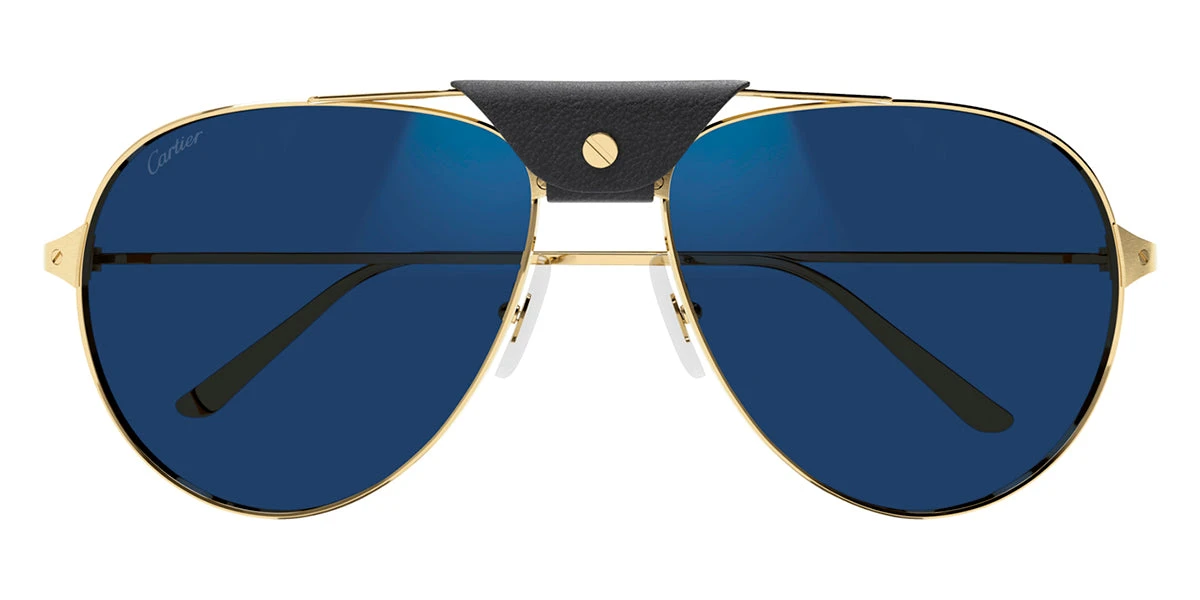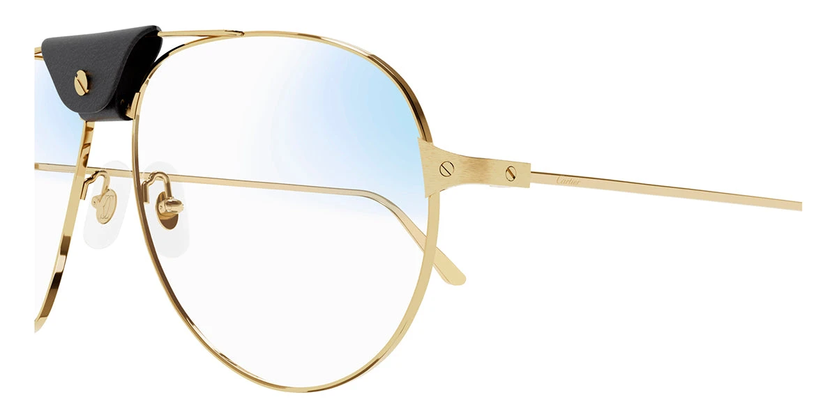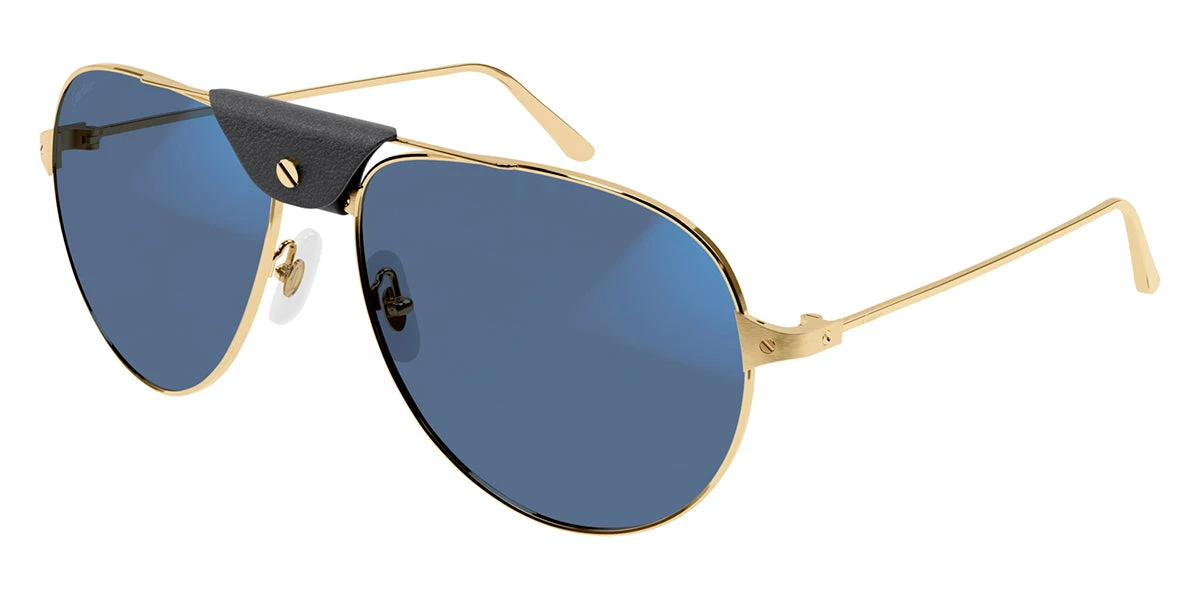 This aviator Cartier sunglass comes in a gold frame with clear blue control to dark grey photochromic lenses.