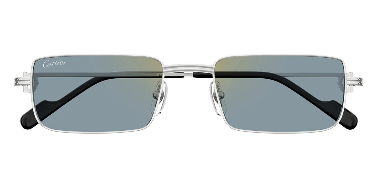 This square Cartier sunglass comes in a silver frame with light blue lenses.