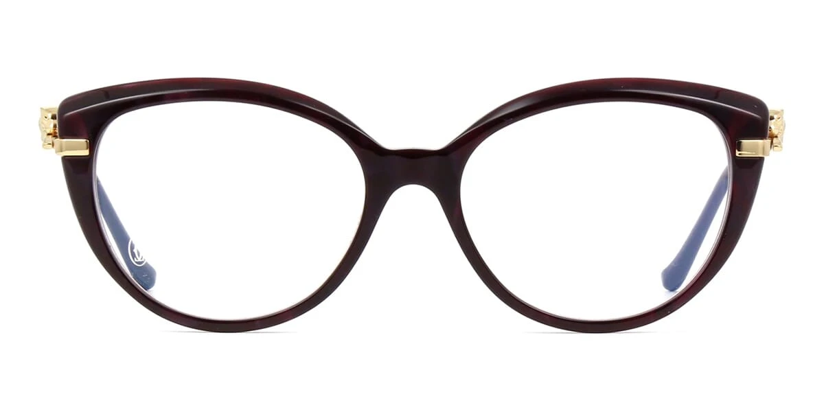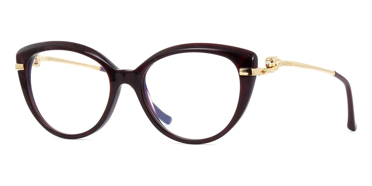 This cat eye Cartier optical comes in a dark violet havana and gold frame.