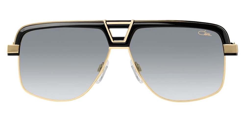 This square Cazal sunglass comes in a black and gold frame with grey gradient lenses.