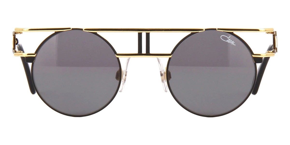 This round Cazal sunglass comes in a gold and black frame with grey lenses.