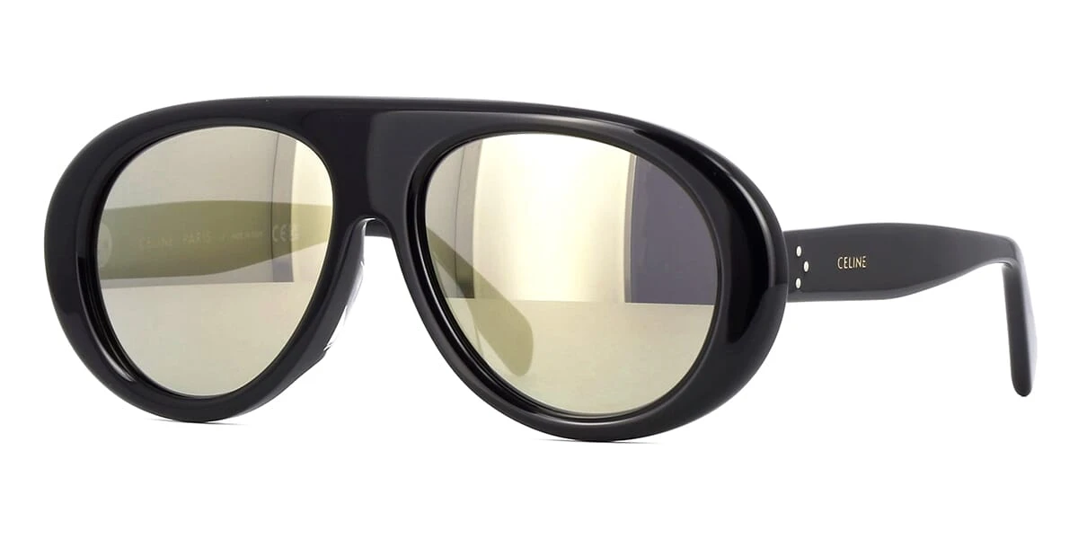 This aviator Celine sunglass comes in a shiny black frame with grey with gold flash mirror lenses.