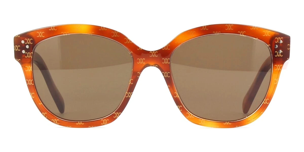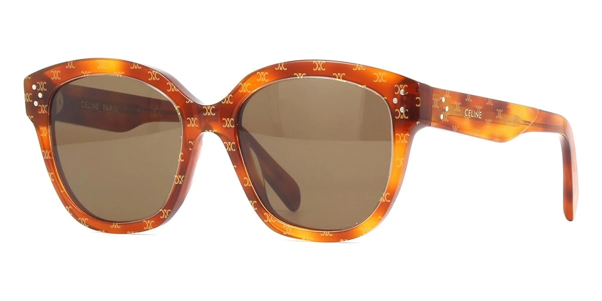 This square Celine sunglass comes in a shiny light havana with gold pattern frame with dark brown lenses.