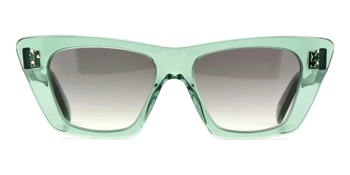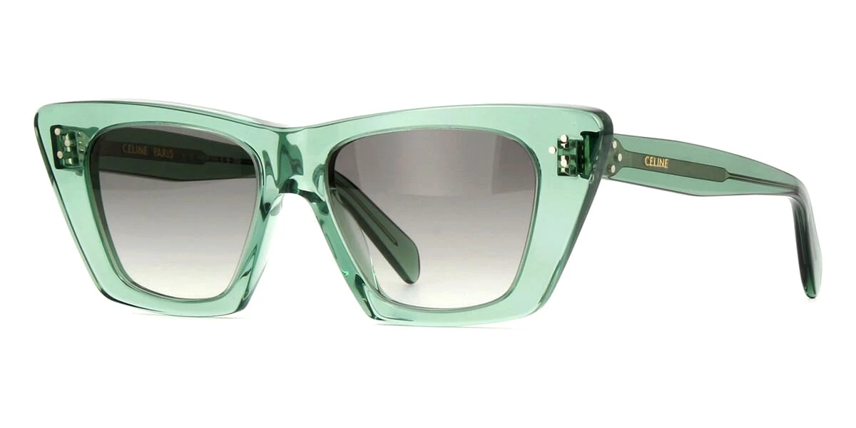 This cat eye Celine sunglass comes in a shiny green crystal frame with grey gradient lenses.