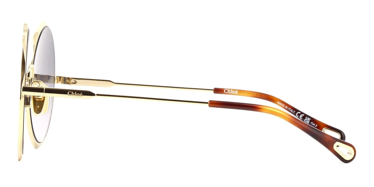 This round Chloe sunglass comes in a shiny light gold frame with grey gradient lenses.