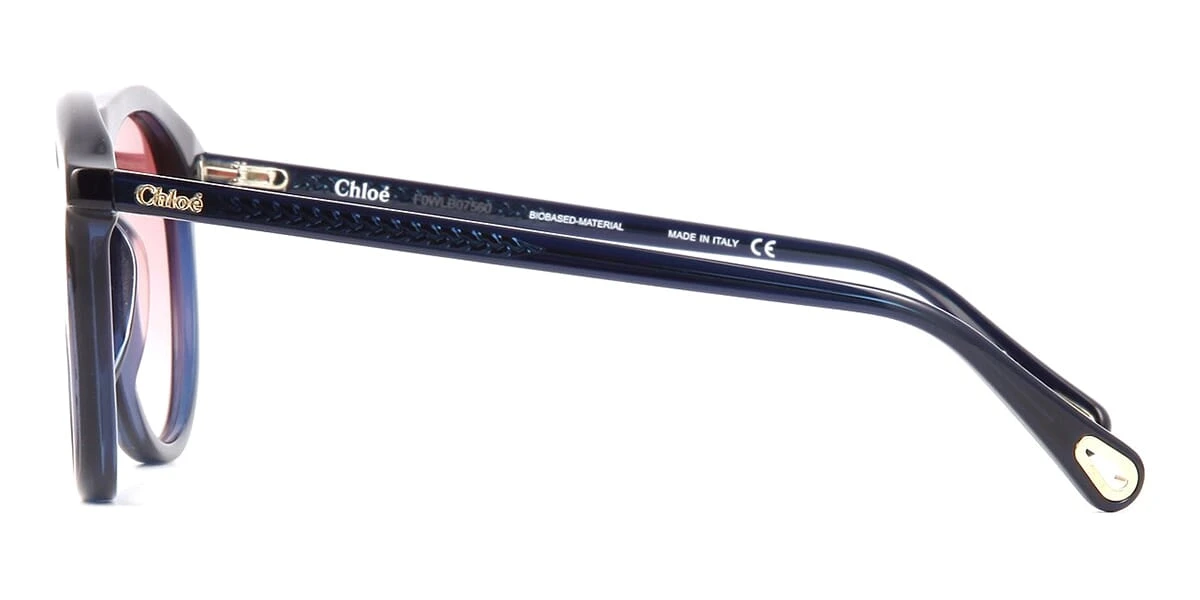 Round blue frames, introduced in Chloe’s Spring/Summer 2021 collection. These are part of the Esther collection, a new concept driven by retro silhouettes. Frames from the Esther collection evoke the natural forms of the ocean shoreline, taking inspiration from the colour, pattern, and delicate transparency of smooth sea-glass. Orange gradient lenses are surrounded by a blue bio-acetate frame. The classically elegant Chloe logo is stamped in gold lettering on the left temple, while both temple tips feature the signature teardrop cut-out, providing both aesthetic appeal, and the option to attach Chloe eyewear jewellery.