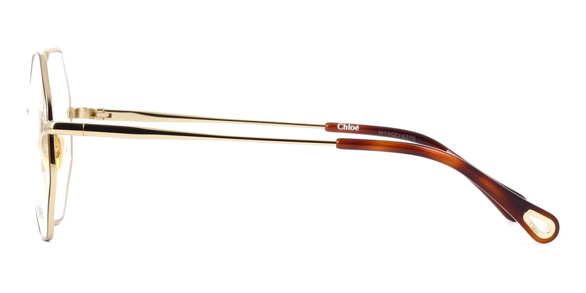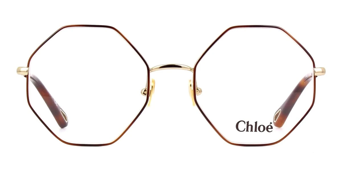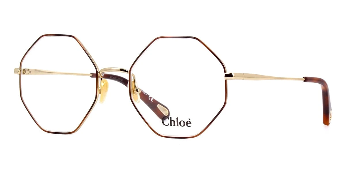 Gold and havana octagonal frames in a 53mm lens width, introduced in Chloe’s Spring/Summer 2021 collection. These are part of the Joni collection, a new retro concept featuring oversized yet finely sculpted wire frames, allowing for effortlessly comfortable wear. Frames from the Joni collection take inspiration from the delicately wrought jewellery and fine accessories which have long been a signature of the Chloe brand. A fashionable geometric lens shape is accentuated by a slim and lightweight gold-plated frame, finished with brown havana bio-acetate temple tips for added comfort. The classically elegant Chloe logo is subtly laser-etched on the left temple, while both temple tips feature the signature tear-drop cut-out, providing both aesthetic appeal, and the option to attach Chloe eyewear jewellery.