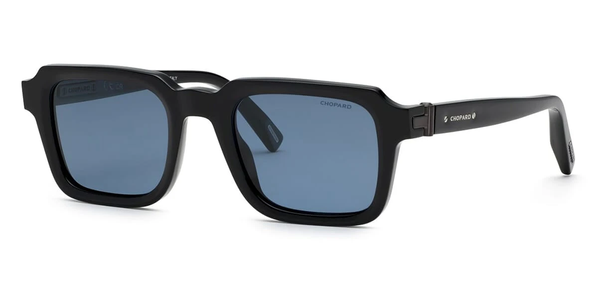 This square Chopard sunglass comes in a shiny black frame with blue lenses.