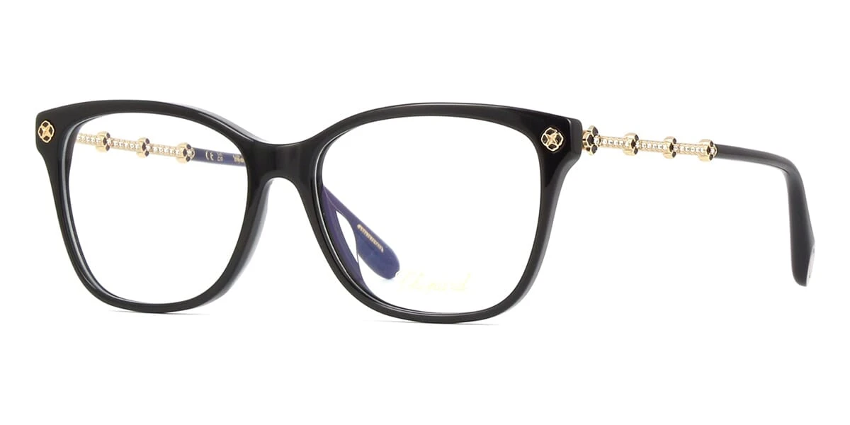 This square Chopard optical comes in a shiny black and gold with white stones frame.