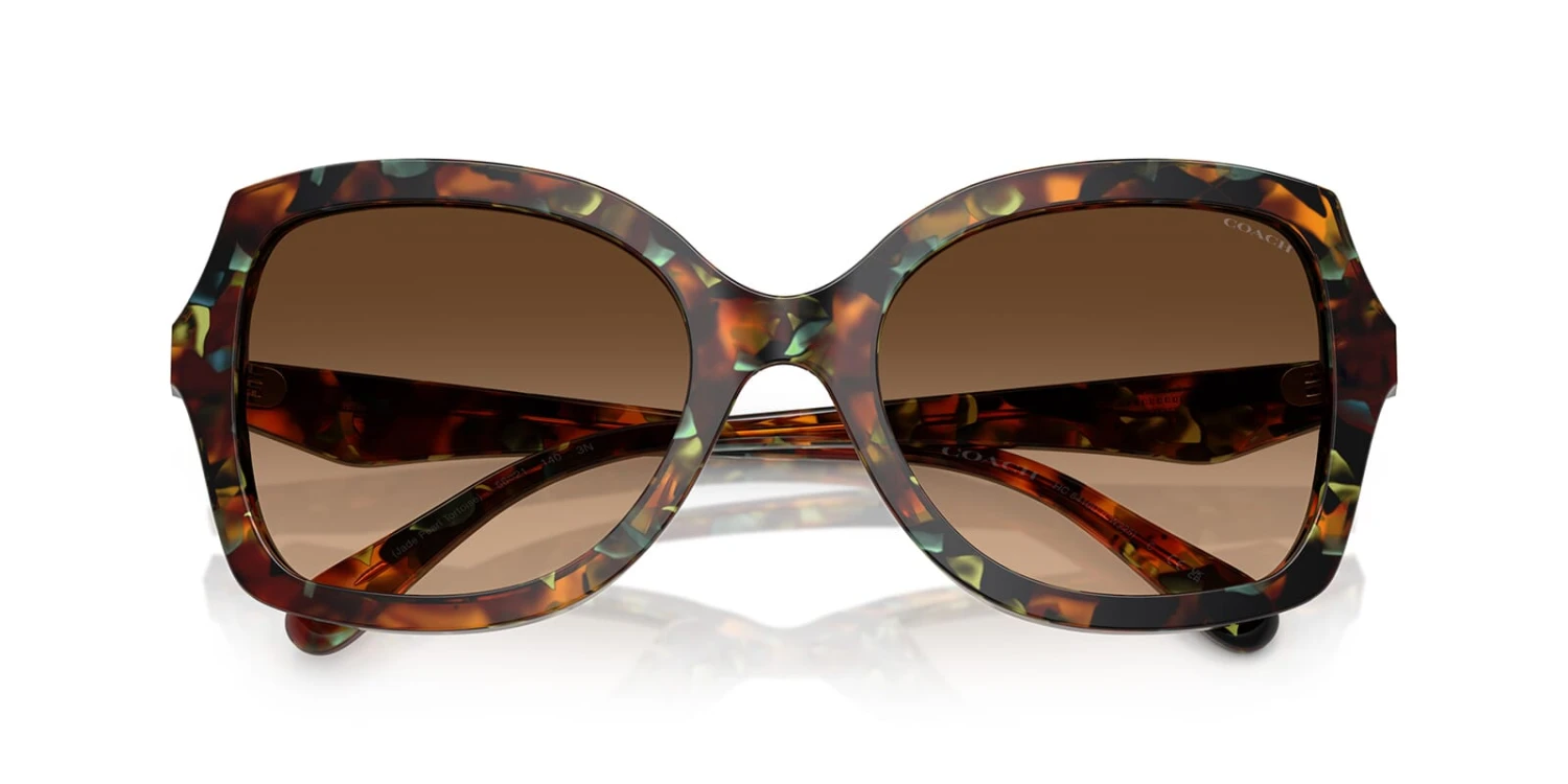 This butterfly Coach sunglass comes in a jade pearl tortoise frame with brown gradient lenses.