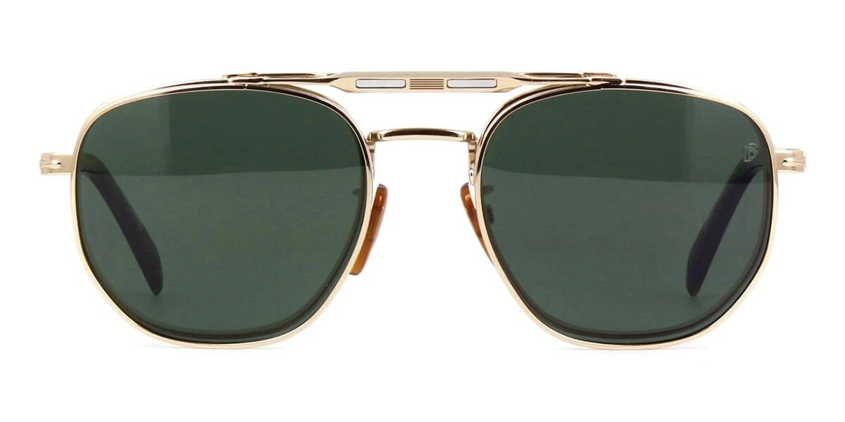 This aviator David Beckham optical comes in a gold with black frame with dark green polarised clip-on lenses.