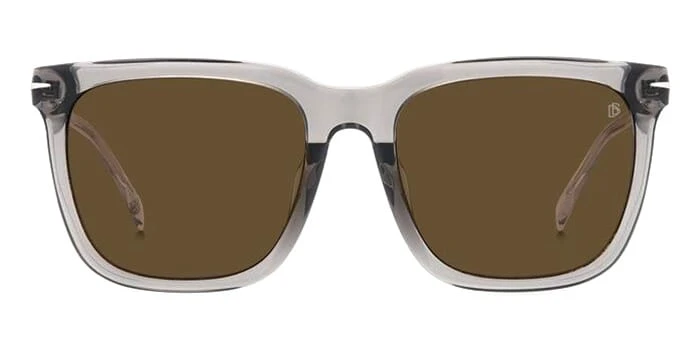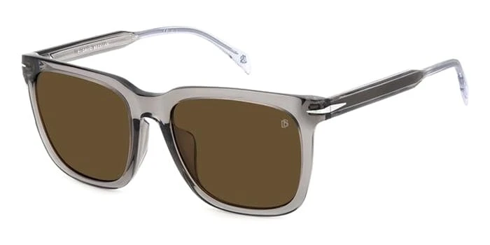 This square David Beckham sunglass comes in a transparent grey frame with brown lenses.